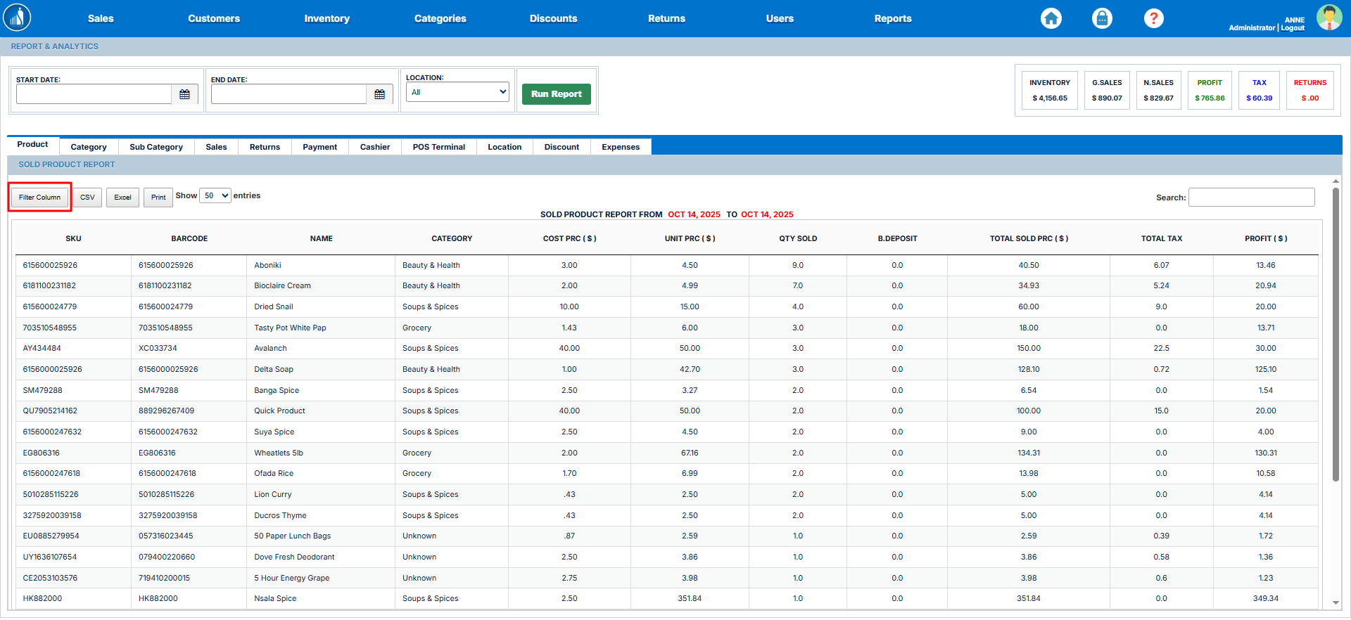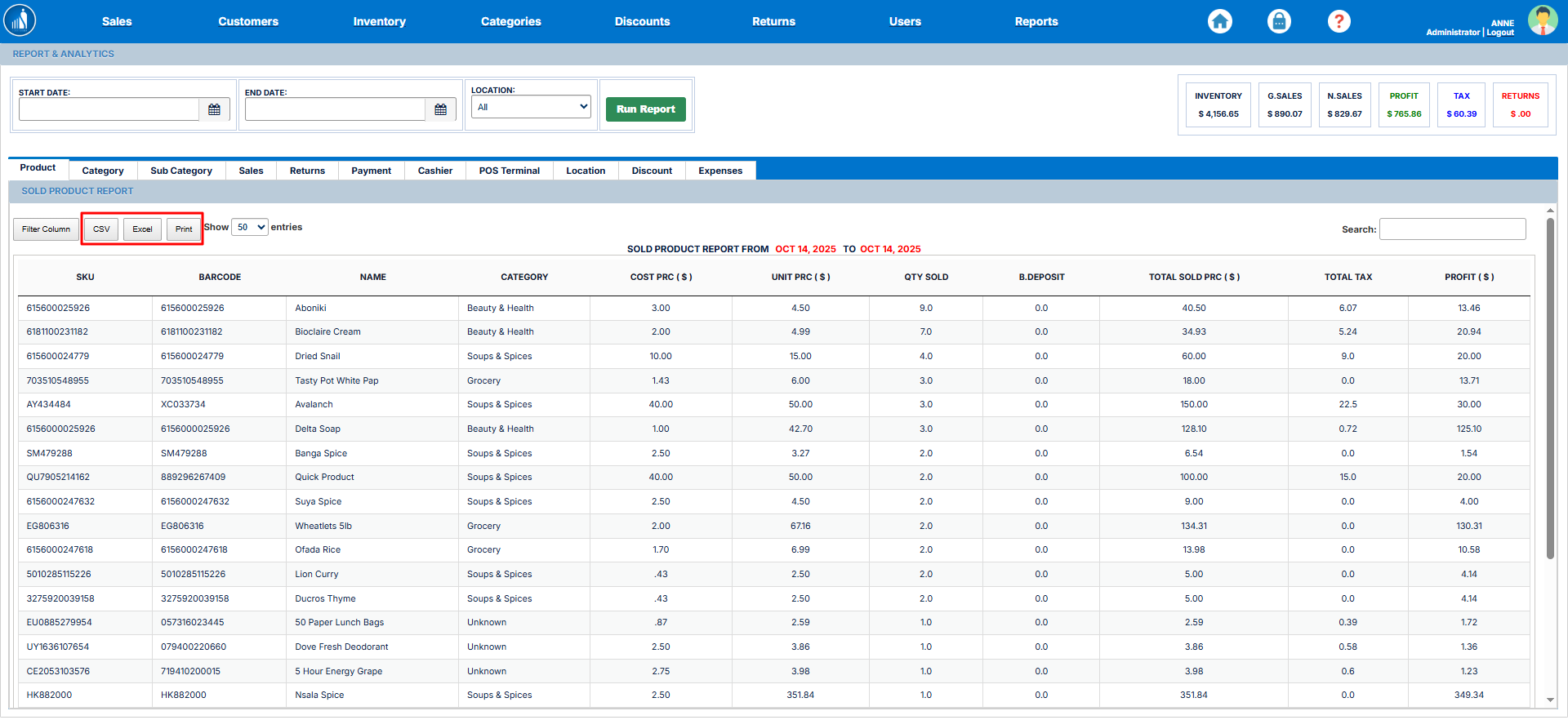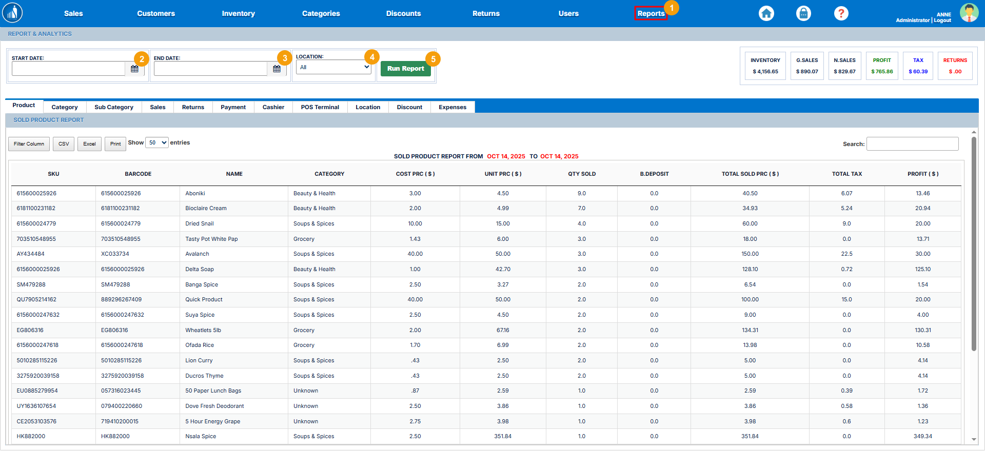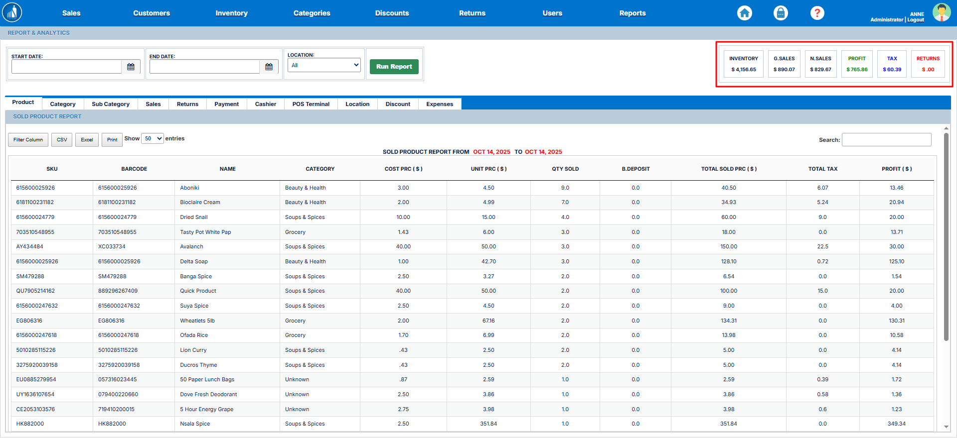The Reports tab allows you to generate detailed insights on sales, inventory, and business performance within a specific time period. You can customize your report by selecting dates and store locations.