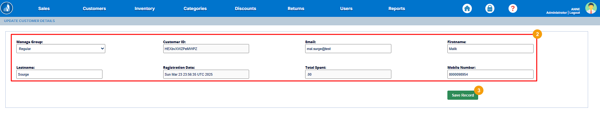 You can easily update or correct customer information such as name, contact details, or address directly from the Customers tab. This ensures that your customer database remains accurate and up to date.