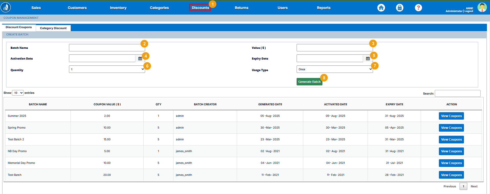 The Batch Discount Coupon feature allows you to generate multiple coupons at once — ideal for marketing campaigns, customer rewards, or seasonal promotions. You can define the coupon value, validity period, and usage type to suit your business needs.