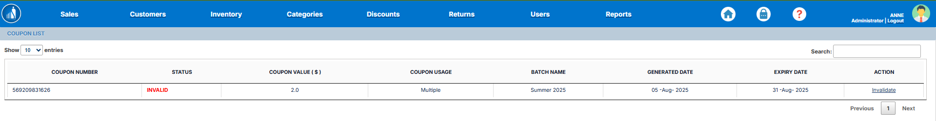 Note: An Invalid status indicates that the coupons in that batch have expired or are no longer redeemable.