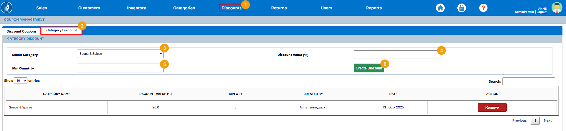 The Category Discount feature allows you to apply discounts to specific product categories. This is useful for promoting seasonal items, clearing stock, or increasing sales within certain product lines.