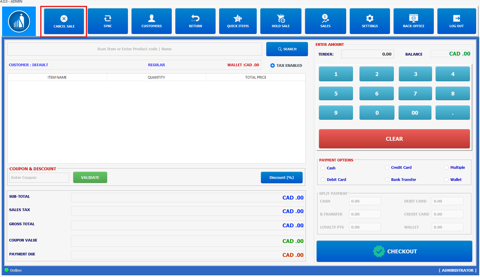Use Cancel Sale to abandon the current transaction before checkout. This clears the cart and resets the screen without saving any items or totals.