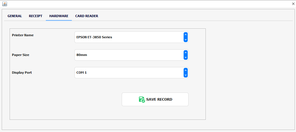 The Hardware tab allows you to configure physical devices connected to your POS terminal — such as receipt printers, cash drawers, and customer displays.
