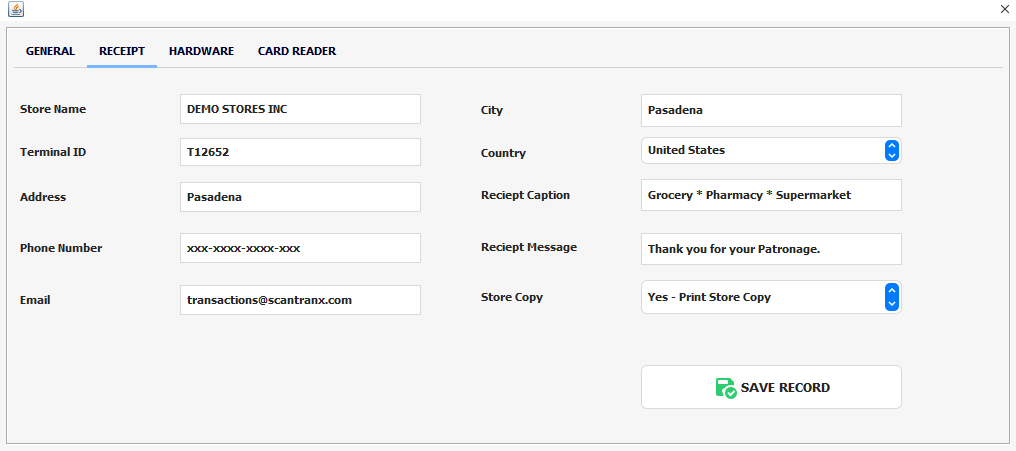 The Receipt tab allows you to customize how receipts are printed for your customers. You can include essential business details, personalize messages, and choose whether to print a store copy after each transaction.