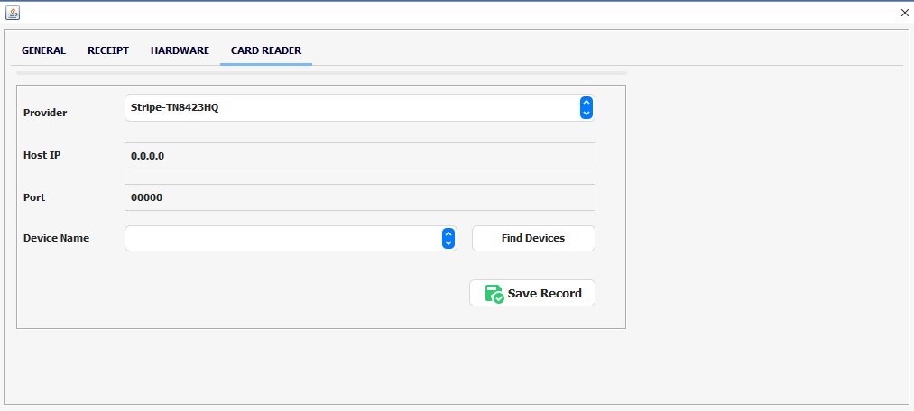 You can connect supported card reader devices by selecting the provider, host IP, and port settings.