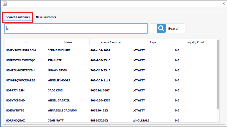 Matching customer details (including Name, Phone Number, Type, and Loyalty Points) will appear in the list below.