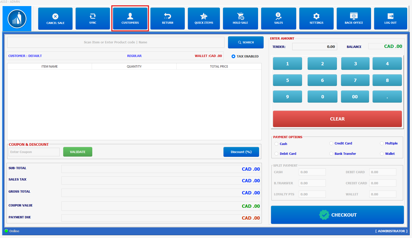 On the main POS interface, click the Customers button from the top menu bar.